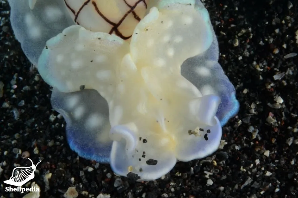 殻長は7mm程で、薄質。卵形で、螺塔は突出せず平巻き。殻表は、細い刻点状の螺溝が密に刻まれる。殻色は白色を地色に、黒褐色で三本の細い螺帯と、湾曲した縦縞が均等に交差する。軟体は半透明白色で、白色斑を散らす。周縁は青色から黄色に染まり、変異に富む。潮間帯から水深30m程までの岩礁底から砂底に生息する。個体数は少ない。